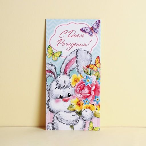 Цена за 10 шт. Конверт для денег С Днем Рождения, зайка с букетом, 16,5 8 см
