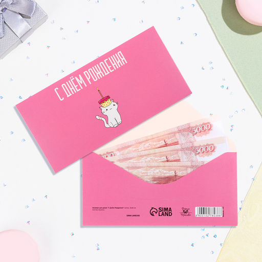Цена за 10 шт. Конверт для денег "С Днём Рождения!" котик, 16х8 см