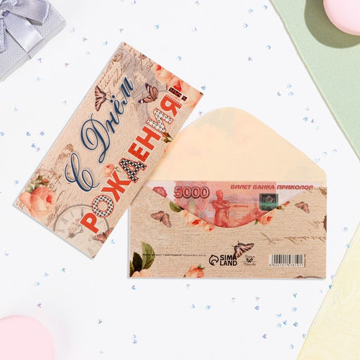Цена за 10 шт. Конверт для денег "С Днём Рождения!" бежевый фон, бабочки, 16х8 см