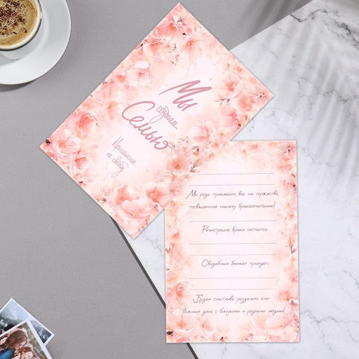 Цена за 20 шт. Пригласительное "Мы создаем семью" розовые цветы, 15х10,5 см