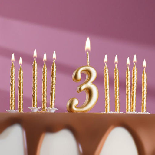 Набор свечей для торта (2 в 1) золотая Цифра "3" + Свечи "С Днём Рождения" золотые 10 шт, 7 см 71508