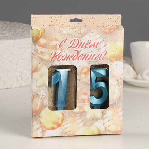 Свеча в торт юбилейная "Грань" (набор 2 в 1), цифра 15 / 51, голубой металлик, 6,5 см