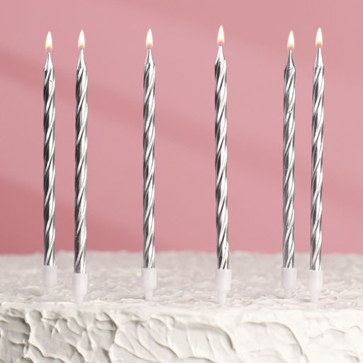 Свечи в торт "Металлик" , 14см, 6шт с подставкой, серебристые