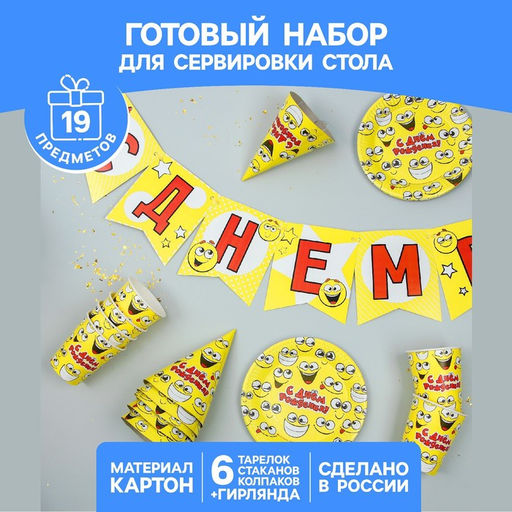Набор бумажной посуды С днём рождения, смайлики: 6 тарелок, 6 стаканов, 6 колпаков, 1 гирлянда
