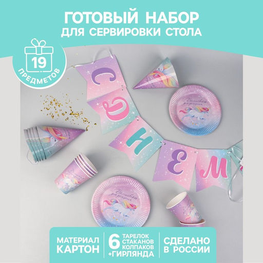 Набор бумажной посуды Волшебного дня рождения. Единорог, 6 тарелок, 6 стаканов, 6 колпаков, 1 гирлянда
