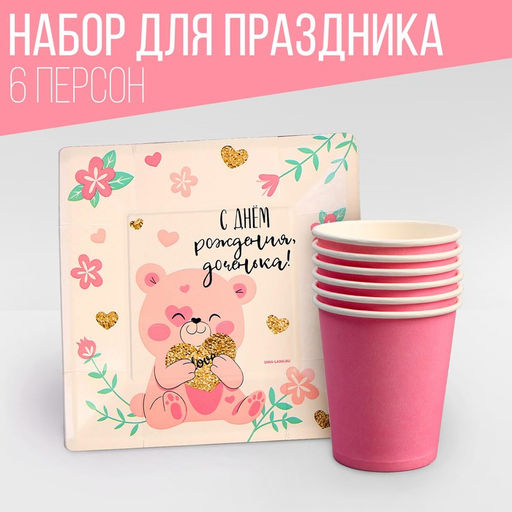 Набор посуды С днём рождения, доченька!: стаканы 6 шт., тарелки 6 шт.