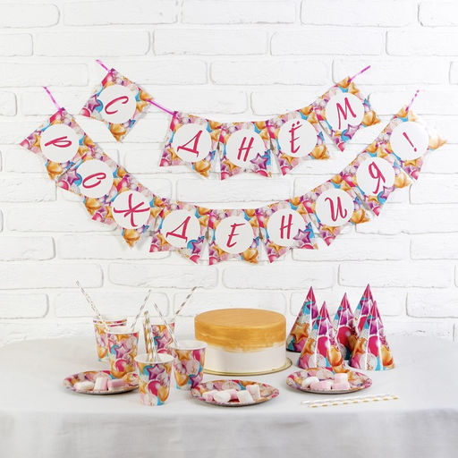 Набор бумажной посуды "С днём рождения", шары, 6 тарелок, 6 стаканов, 6 колпаков, 1 гирлянда