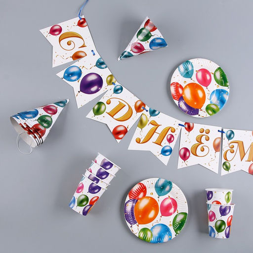 Набор бумажной посуды С днём рождения, шары: 6 тарелок, 1 гирлянда, 6 стаканов, 6 колпаков