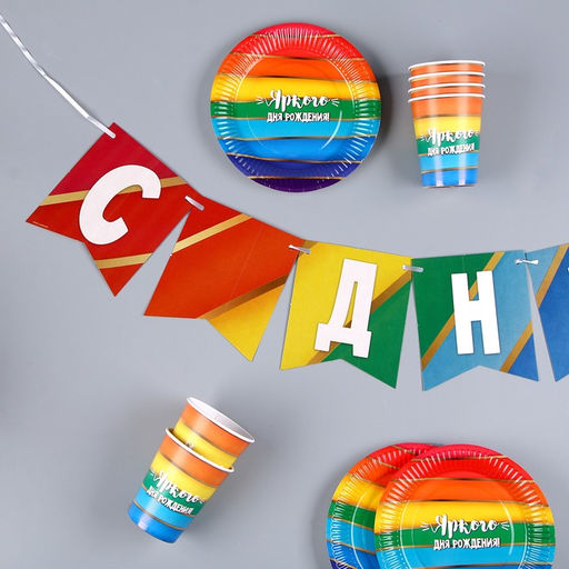 Набор бумажной посуды Радуга: 6 тарелок, 1 гирлянда, 6 стаканов