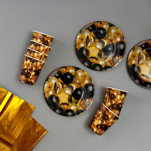 Набор бумажной посуды Чёрное золото! Шары: 6 тарелок, 6 стаканов, скатерть