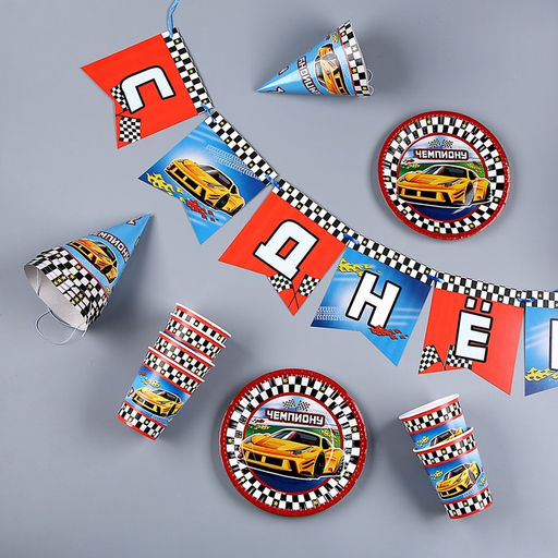 Набор бумажной посуды Машины: 6 тарелок, 1 гирлянда, 6 стаканов, 6 колпаков