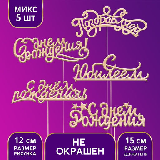 Цена за 5 шт. Топпер Ассорти Поздравления на все случаи жизни, без печати, 1 шт, в фасовке 5 разных