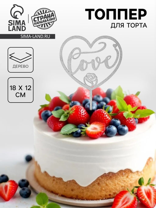 Топпер деревянный "Сердце" с блестками, цвет серебро