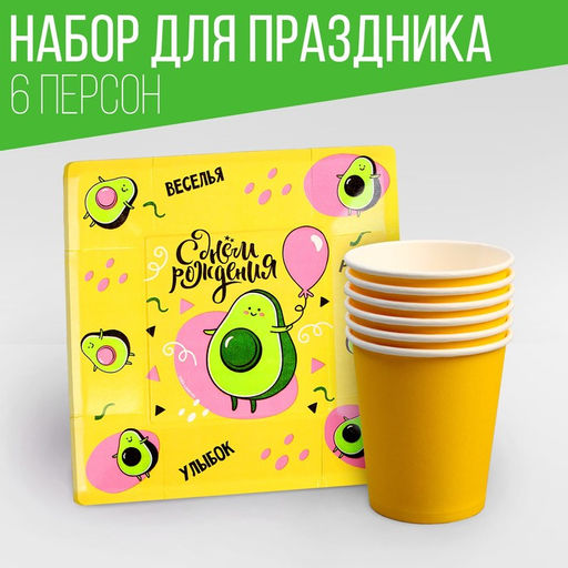 Набор посуды С днём рождения! Авокадо: стаканы 6 шт., тарелки 6 шт.