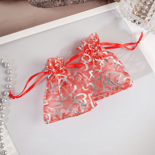 Цена за 100 шт. Мешочек подарочный "Сердечки" крупные, 7 х 9, цвет красный с серебром