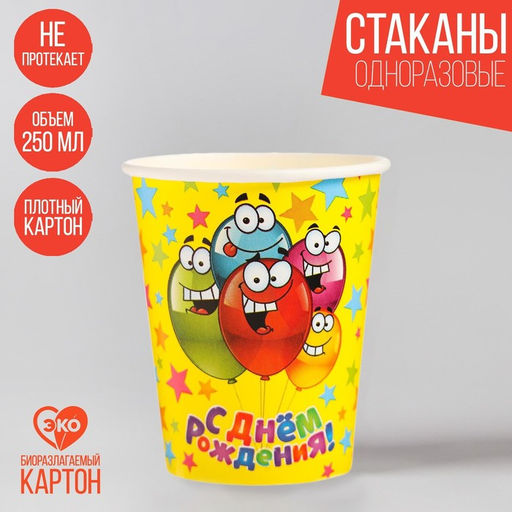 Набор бумажных стаканов С днём рождения, весёлые шарики, 250 мл, 6 шт.