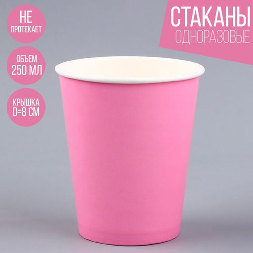 Стакан бумажный однотонный, объём 250 мл, в наборе 10 шт., цвет розовый