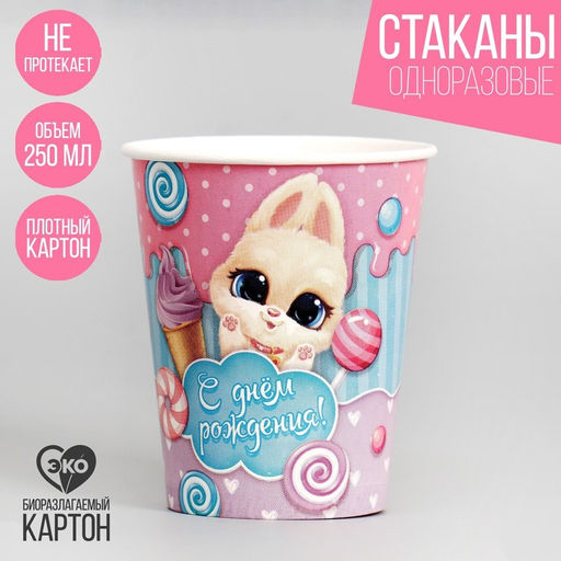 Стакан бумажный С днём рождения, зайка, набор 6 шт., 250 мл