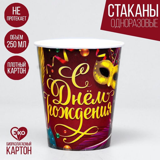 Стакан бумажный С днём рождения, карнавал, набор 6 шт., 250 мл