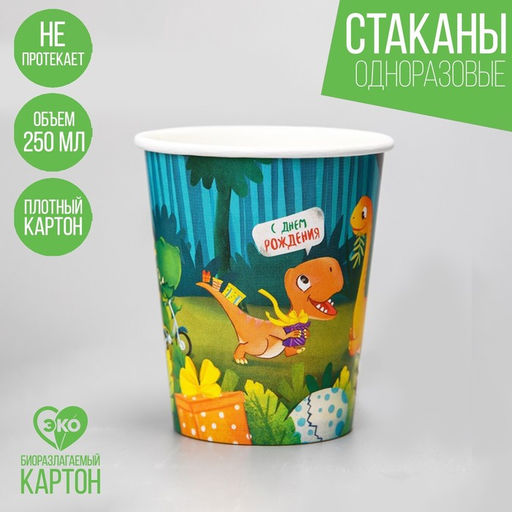 Цена за 10 шт. Стакан бумажный С днём рождения, динозаврики, 250 мл