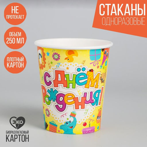 Набор бумажных стаканов С днём рождения, зверушки, 250 мл, 6 шт.