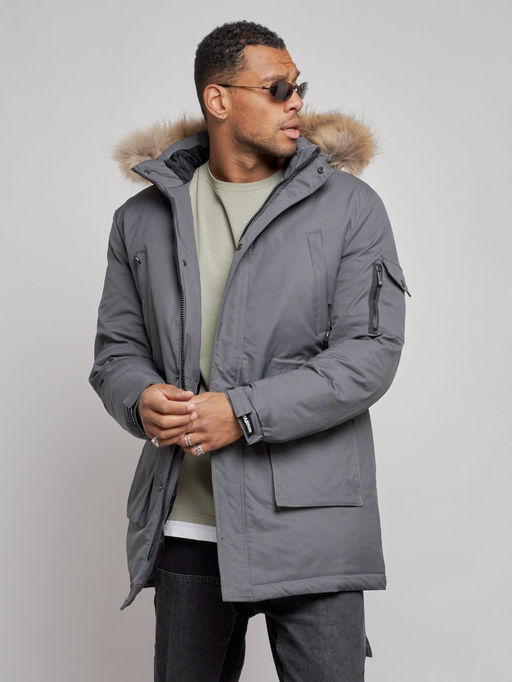 Парка мужская зимняя удлиненная с мехом темно-серого цвета 8318TC