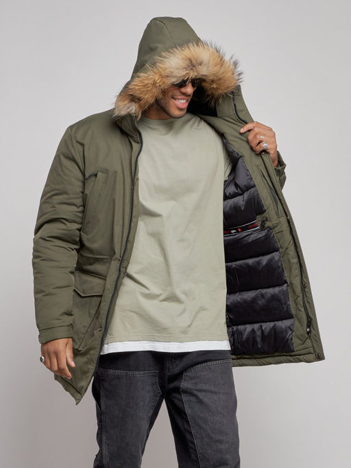 Парка мужская зимняя удлиненная с мехом цвета хаки 8318Kh