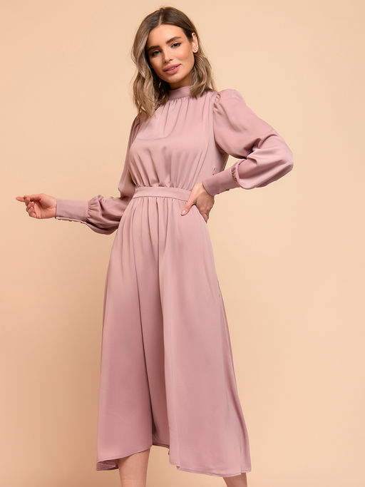 Платье длины миди розовое с драпировкой и длинными рукавами