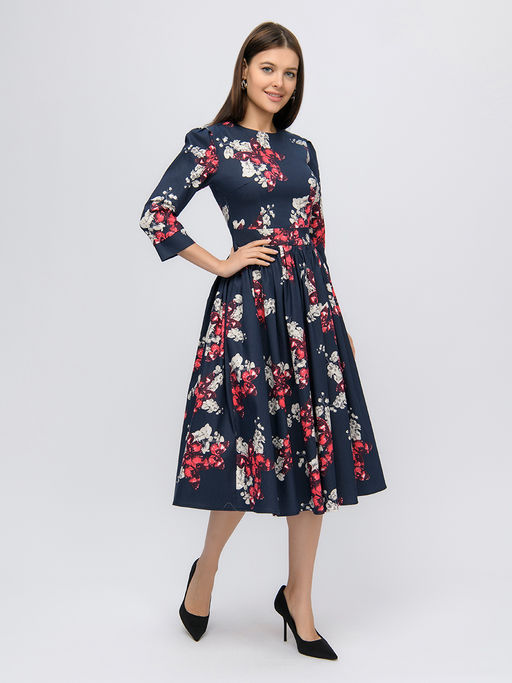 Платье темно-синее длины миди с принтом и рукавами 3/4