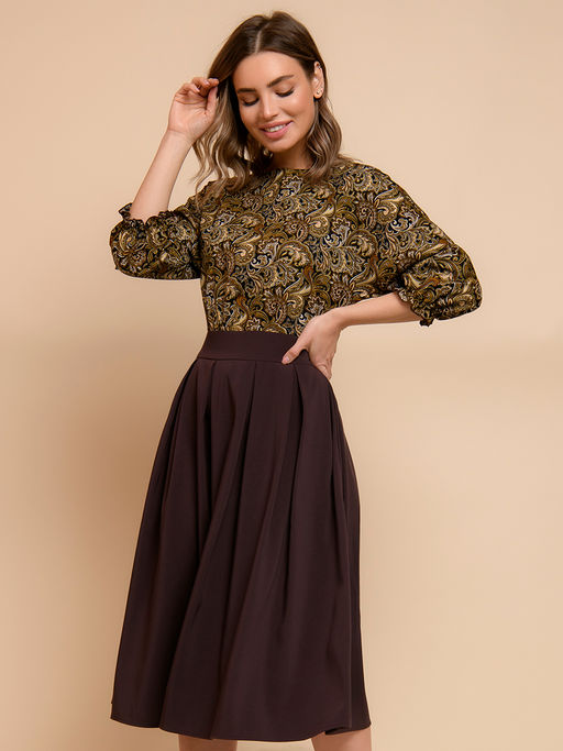 УЦЕНКА. Платье темно-коричневое длины миди с принтованным верхом и рукавом "летучая мышь"