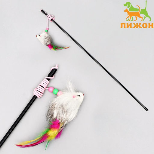 Дразнилка-удочка с мышью из натурального меха с перьями, микс цветов