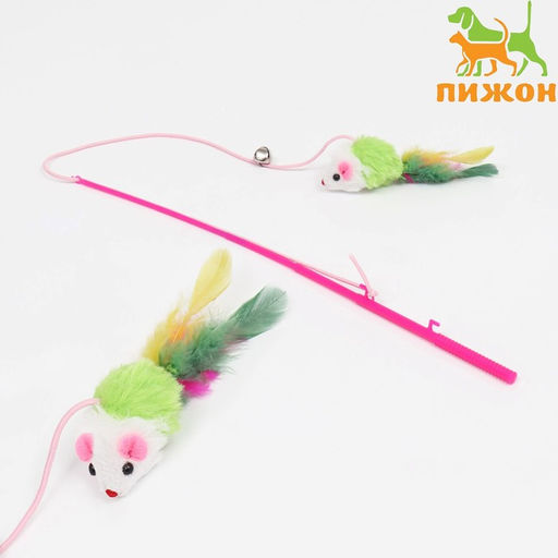Дразнилка-удочка "Цветная мышка", 32 см, белая/зелёная мышь на розовой ручке