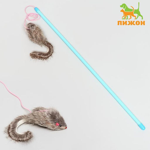 Дразнилка-удочка с серой мышью из натурального меха, 46 см, палочка микс цветов