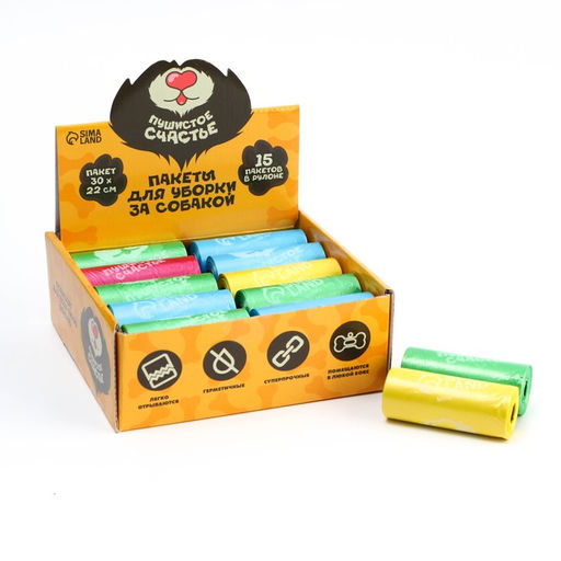 Цена за 20 шт. Пакеты для уборки за собаками в шоубоксе Пушистое счастье (20 рулонов по 15 пакетов, 22 х 30 см)