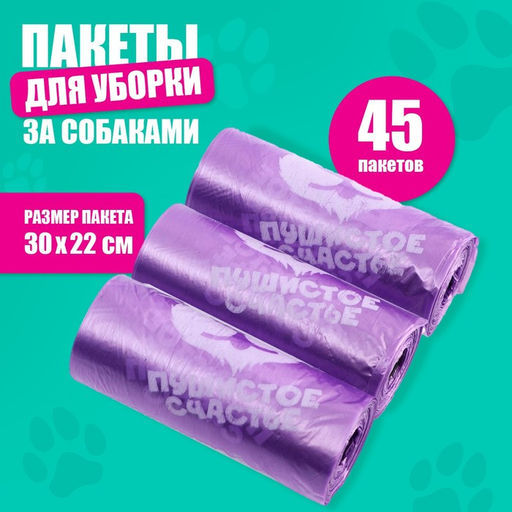 Пакеты для уборки за собаками Пушистое счастье (3 рулона по 15 пакетов, 22 х 30 см), сиреневый