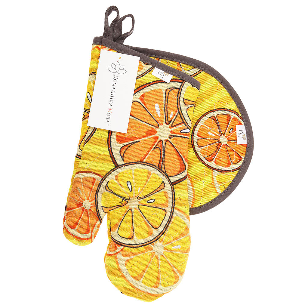 Кухонный комплект "Апельсинки, вид 5": прихватка-варежка 15х30см + прихватка 20х25см форма "Капелька", рогожка 171г/м2, хлопок 100%, наполнитель - ватин 280г/м2, на пластмассовом подвесе, "Домашняя мода" (Россия)