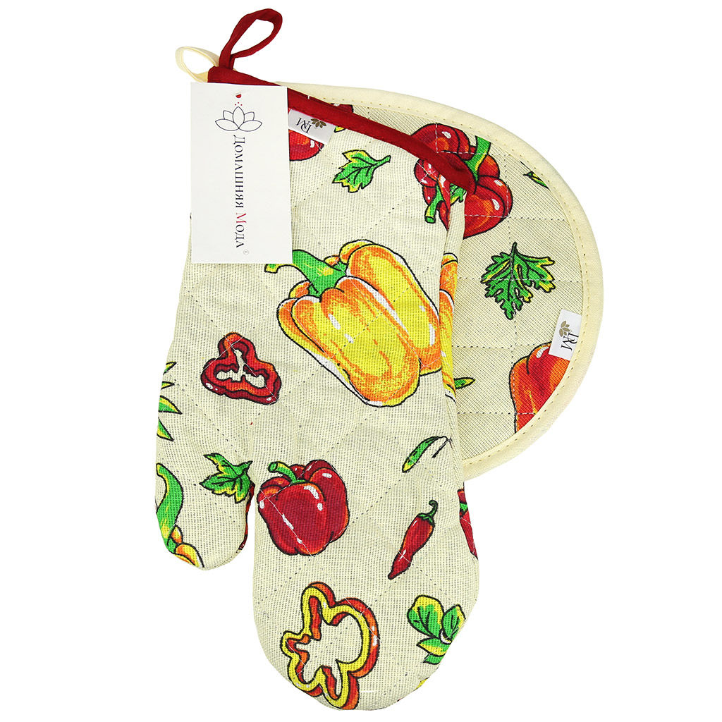 Кухонный комплект "Перцы": прихватка-варежка 15х30см + прихватка 20х25см форма "Капелька", рогожка 171г/м2, хлопок 100%, наполнитель - ватин 280г/м2, на пластмассовом подвесе, "Домашняя мода" (Россия)