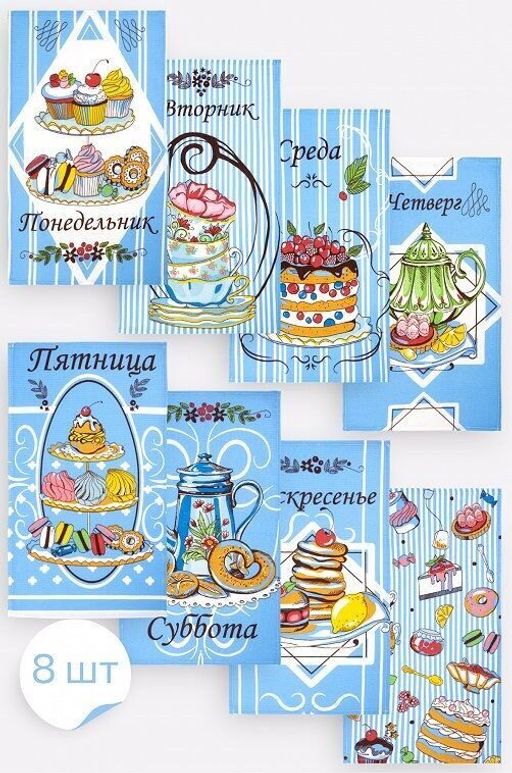 Комплект кухонных вафельных полотенец "Дни недели-Сладкий мир"-голуб. 35х60 см -8 шт. Хлопок 100%