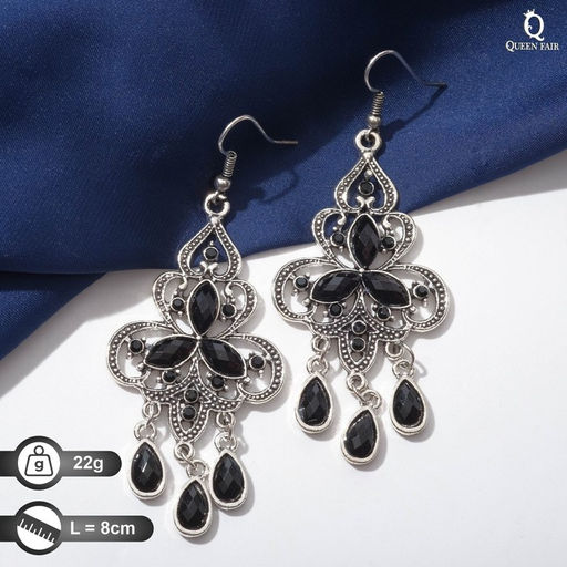 Серьги висячие со стразами "Восток" трилистник, цвет чёрный в чернёном серебре, 8см