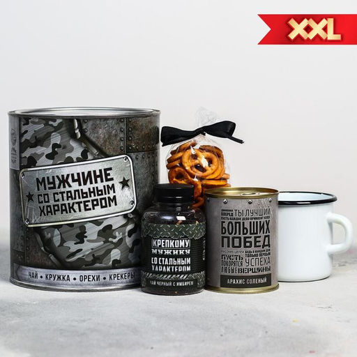 Подарочный набор Мужчине со стальным характером: чай 50 г, кружка 350 мл, орехи 300 г, крекер 70 г
