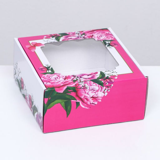 Цена за 5 шт. Коробка самосборная, с окном, "Весенние пионы", 19 х 19 х 9 см