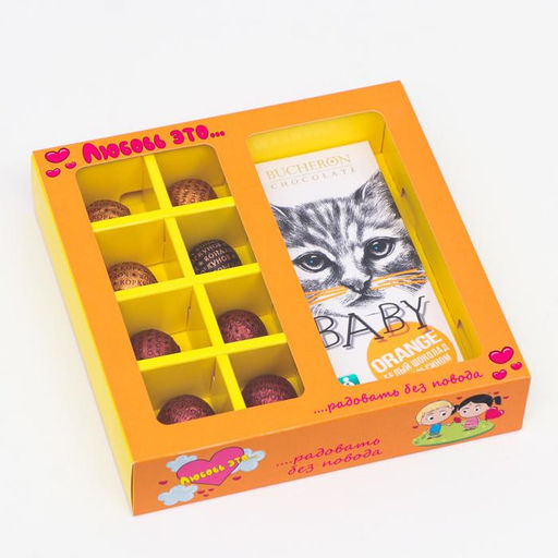 Цена за 5 шт. Коробка под 8 конфет + шоколад, с окном , "Любовь-это...", оранжевая, 17,7 х 17,85 х 3,85 см