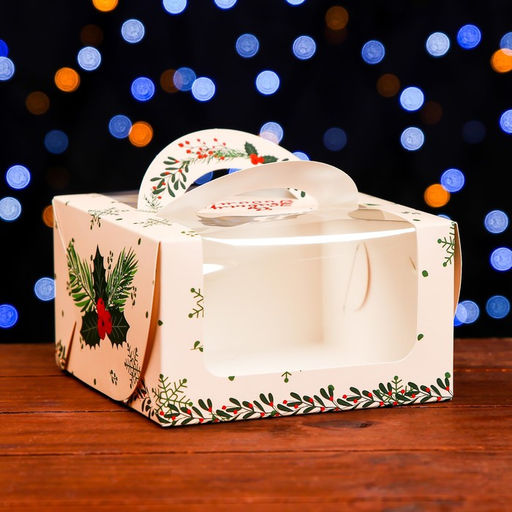 Коробка под бенто-торт с окном "Новогодняя с шишками", 14 х 14 х 8 см