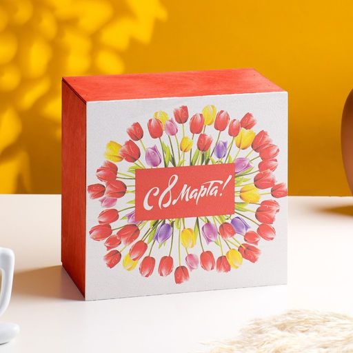 Ящик деревянный "8 Марта. Тюльпаны" 20х20х10 см красный