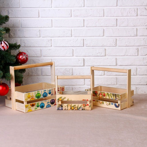 Набор кашпо деревянных "Новогодний №3" 3 в 1, МАССИВ СОСНЫ, деревянная ручка, натуральный