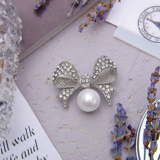 Брошь "Жемчужинка" классический бантик, цвет белый в серебре
