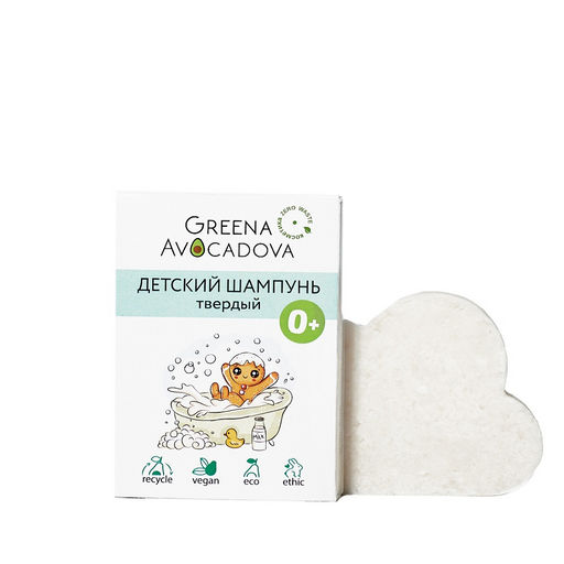 GREENA AVOCADOVA Шампунь твердый для ДЕТСКОЙ кожи головы и волос без слез 0+, 60 г