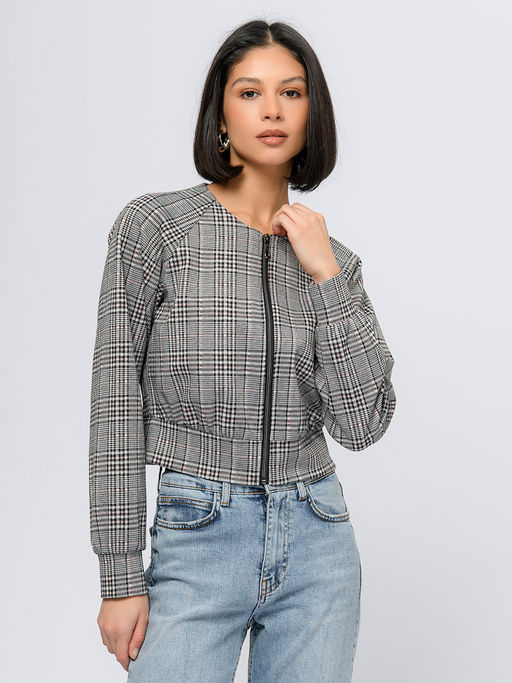 Жакет серого цвета укороченный с розовой клеткой и объемными рукавами