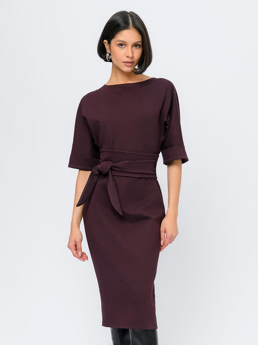 Платье бордового цвета длины миди с поясом и рукавами "летучая мышь"