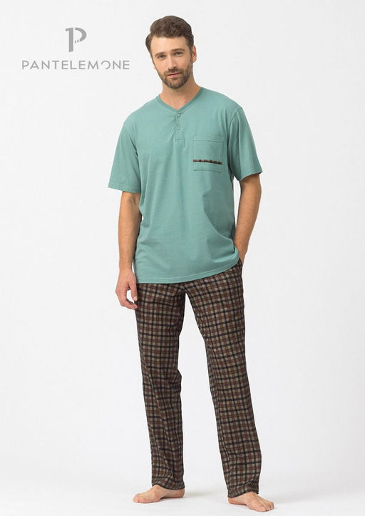 Домашний мужской комплект PDK-321 Зеленый/Клетка бежевая/оранжевая